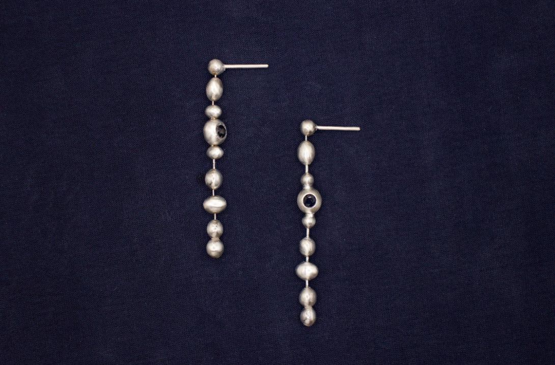 Each ball component is hand-soldered to its link, and every link moves freely. Each pair features two blue sapphires flush-set in solid sterling silver, creating a smooth, stone-level surface and a minimal, artful look. The brushed matte finish softens reflections, making them an elegant statement for everyday wear.
