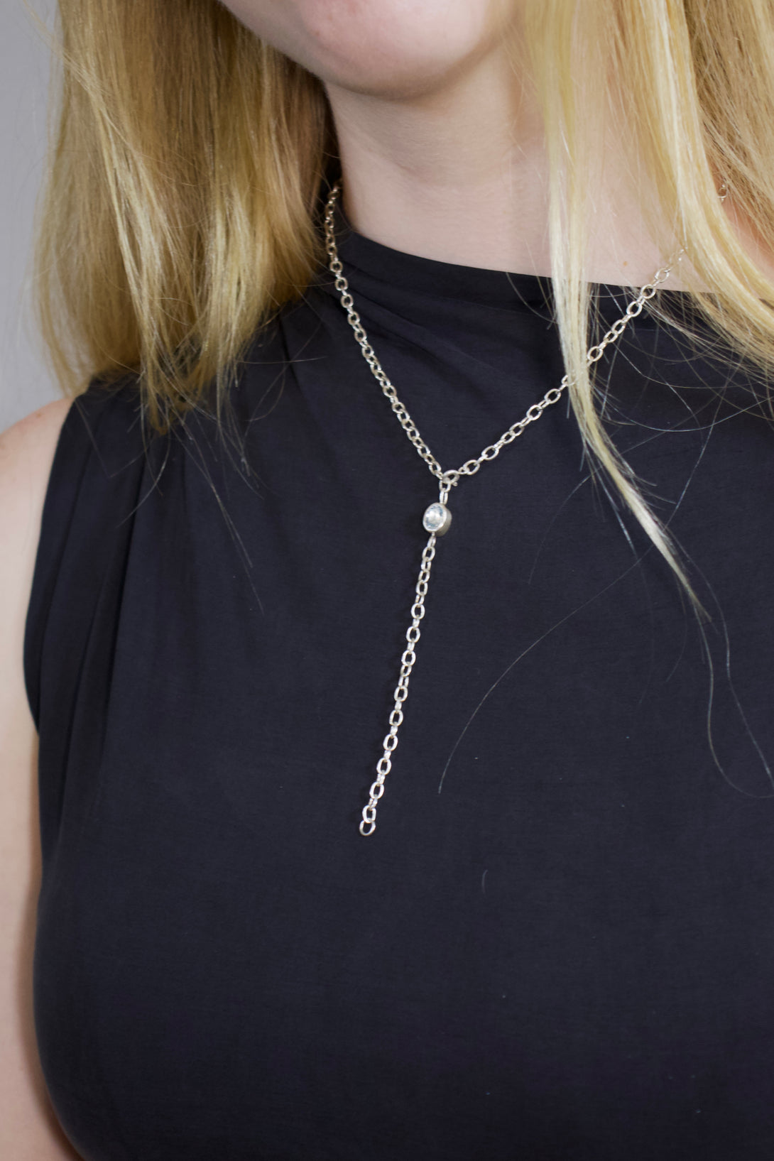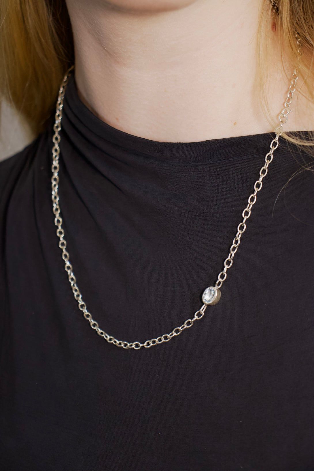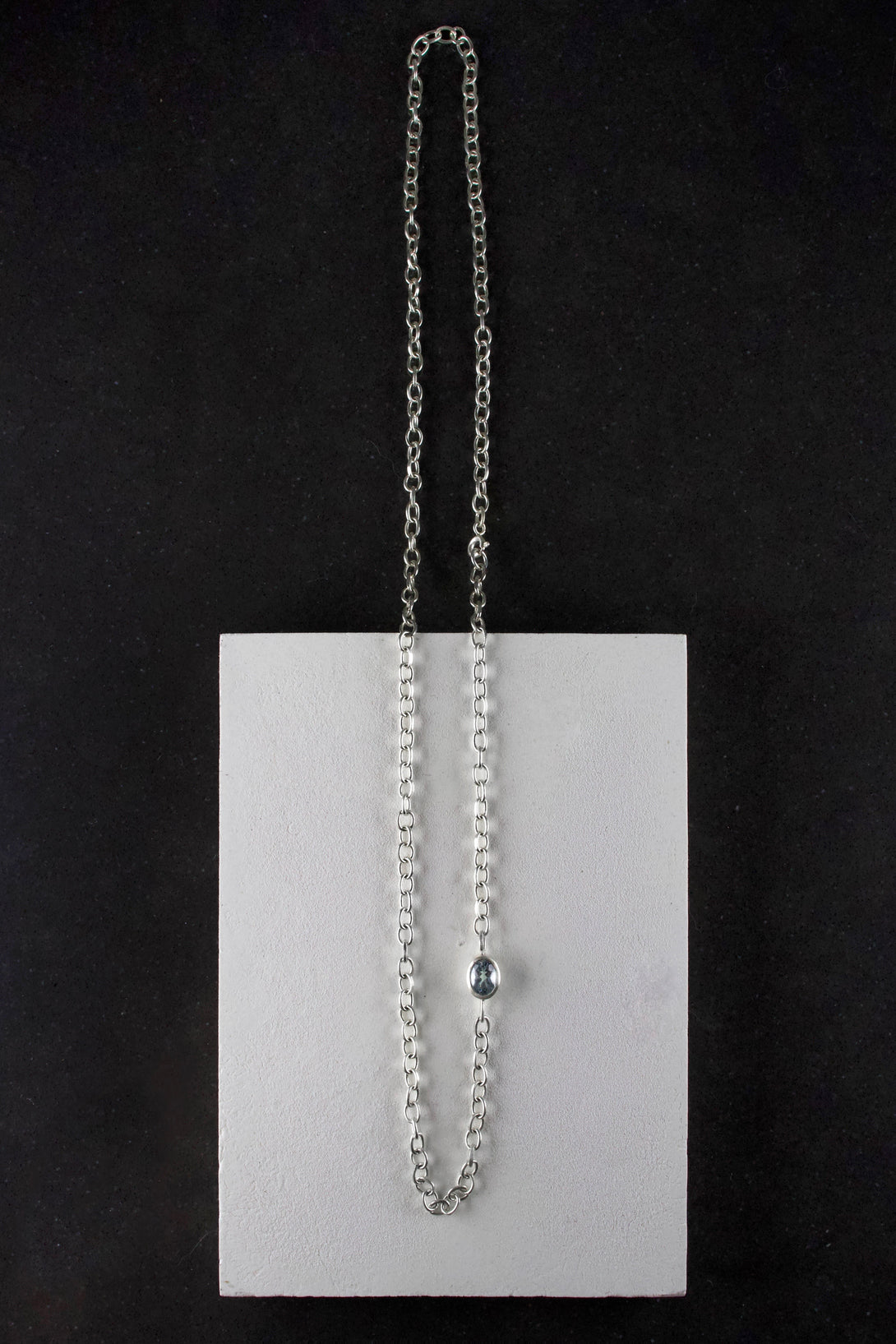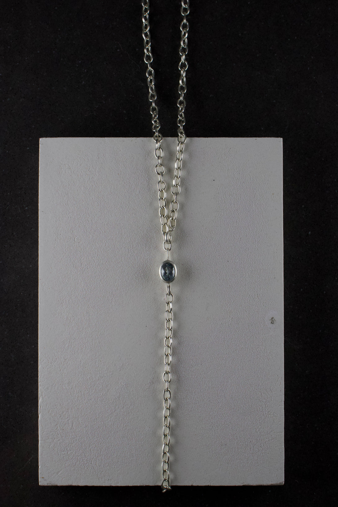 A chain necklace with a brushed matte finish. The handmade sterling silver chain features a single bezel-set aquamarine. The design allows for two different ways to wear — as a drop-style lariat or as a shorter centered necklace.