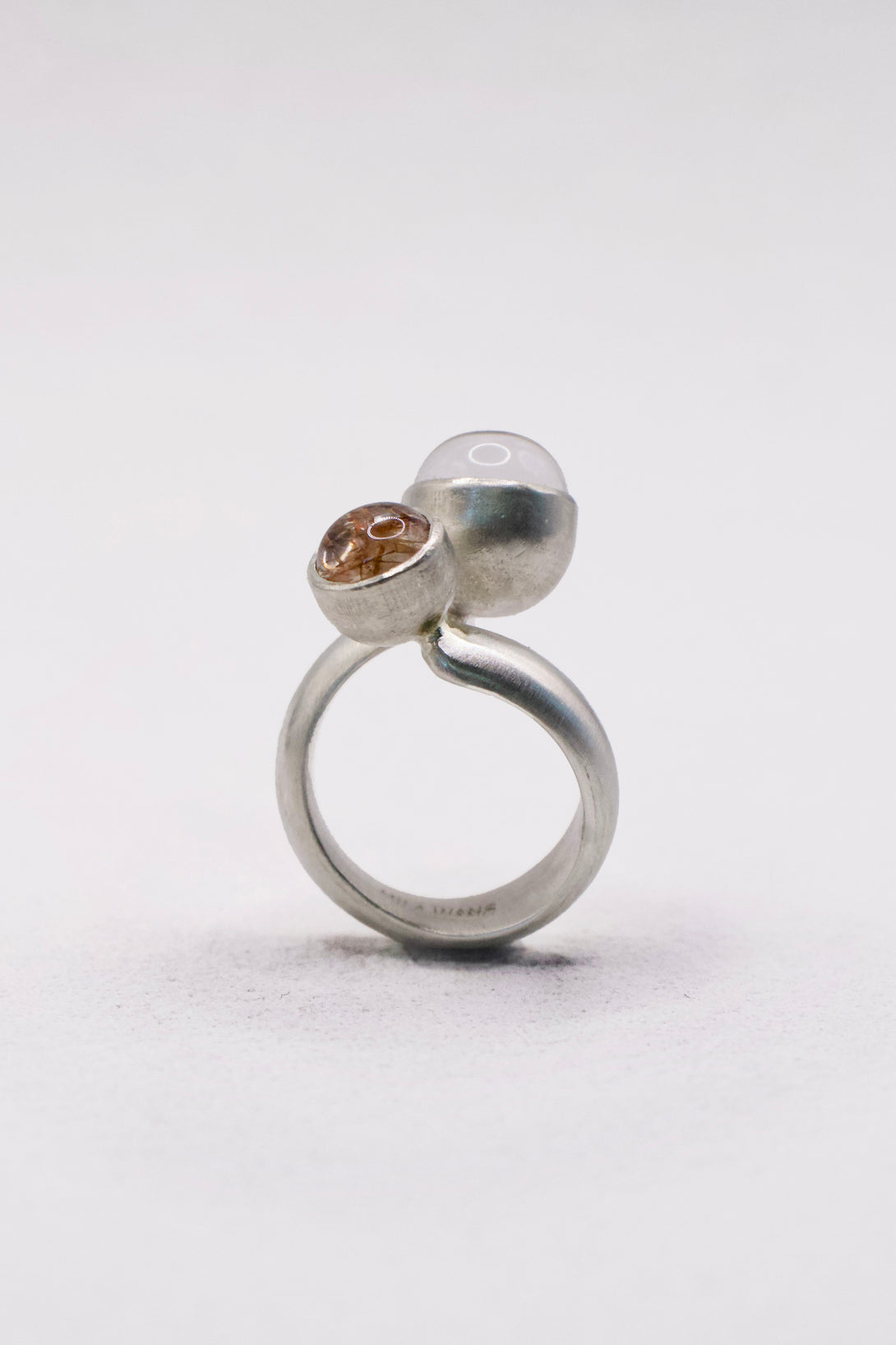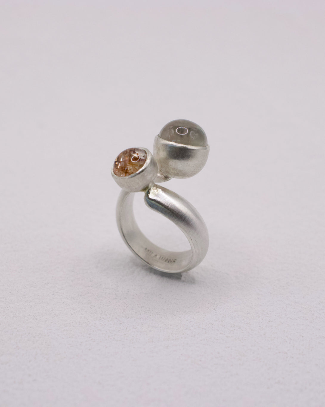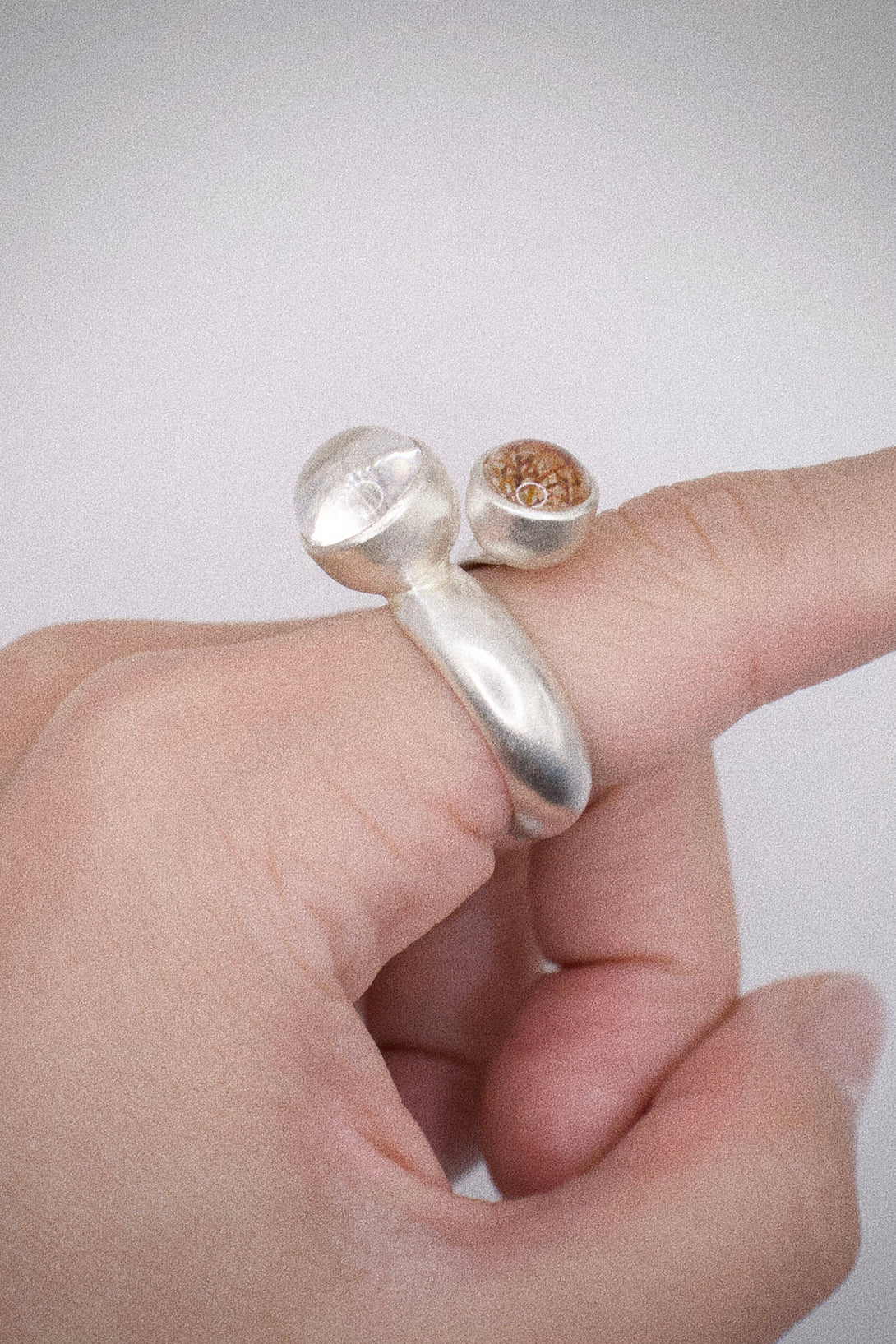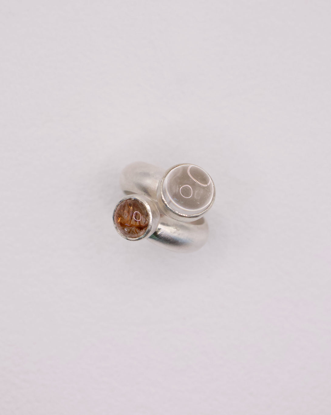 A minimal open band set with two cabochons, balancing simplicity with sculptural presence. The adjustable design allows the ring to be worn comfortably across sizes, while the brushed matte finish softens reflections and emphasizes its understated form.