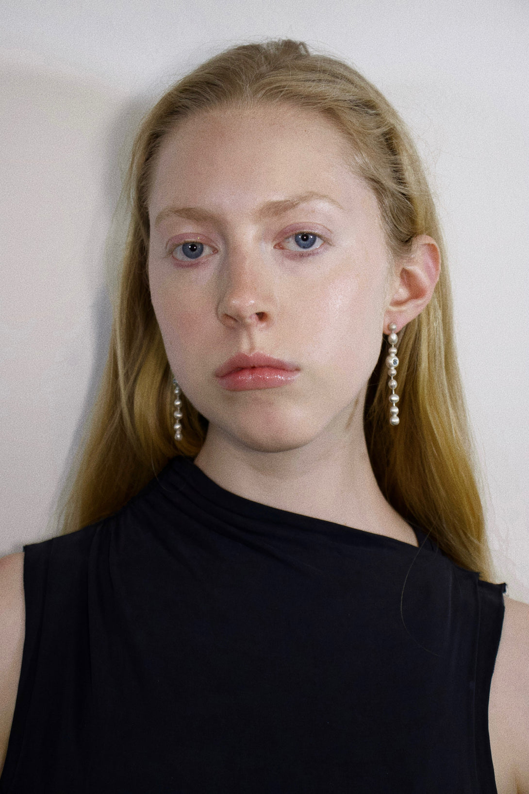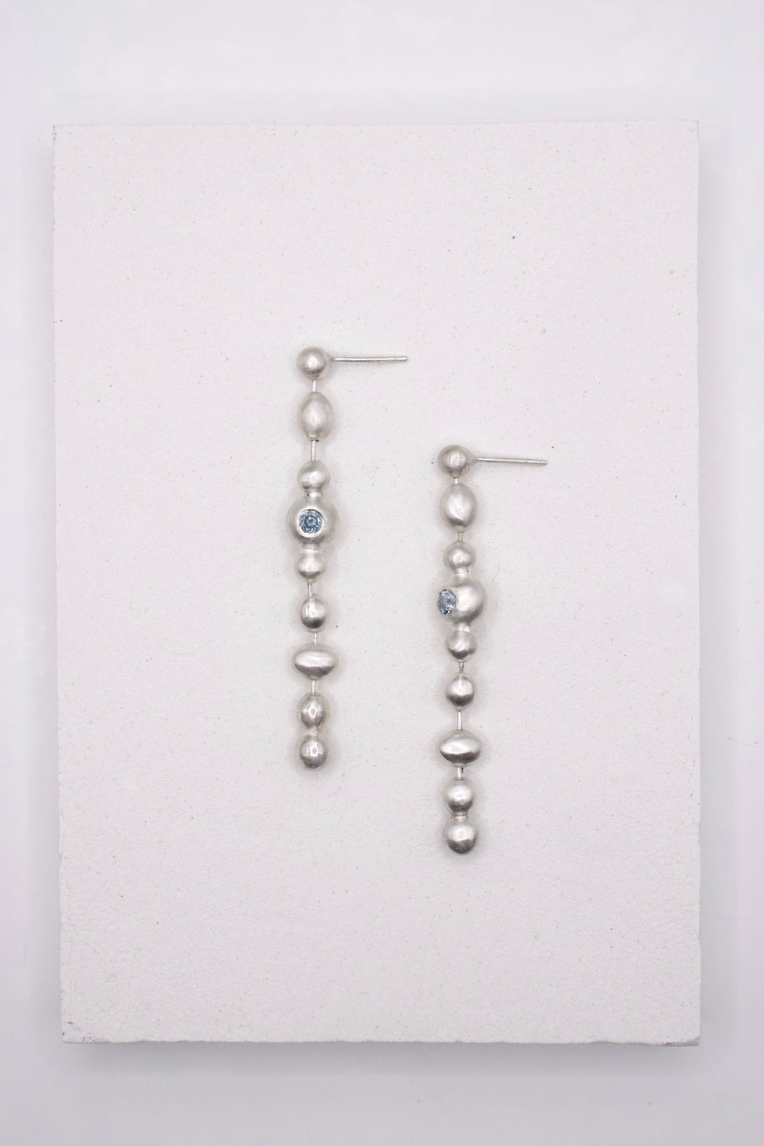 A sculptural, mirrored drop silhouette with a quiet glow. Each ball component is hand-soldered to its link, and every link is movable. Each pair features two grey spinels flush-set in solid sterling silver, creating a smooth, stone-level surface and a minimal, artful look. The brushed matte finish softens reflections for an elegant, everyday statement.