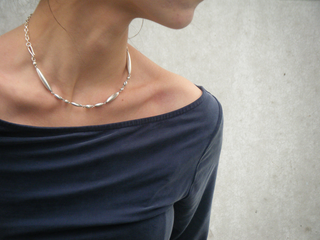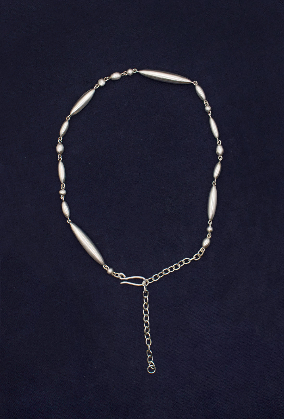 the Elliptical Form Necklace is composed of interlocking oval links in sterling silver. Each link is hand carved in wax, cast, and brushed to a soft matte finish, creating a clean and understated texture.